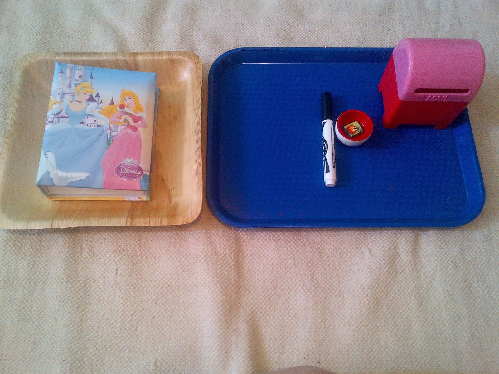 This is the activity that builds on the flower painting activity pictured above. I placed the album* here for Ella to use for reference, all of the pictures in the album are of people that she loves and their names are labeled on each picture with small white circle stickers. Ella will look through the album for someone that she wants to address a “valentine” to, write as much of their name as she chooses with the black marker (possibly just a first initial) and then attach a 1cent stamp onto each card before “mailing it” in the cute little postbox.* After this activity is complete, I have a small “receiving” mailbox that I will fill with little valentine treats for her.