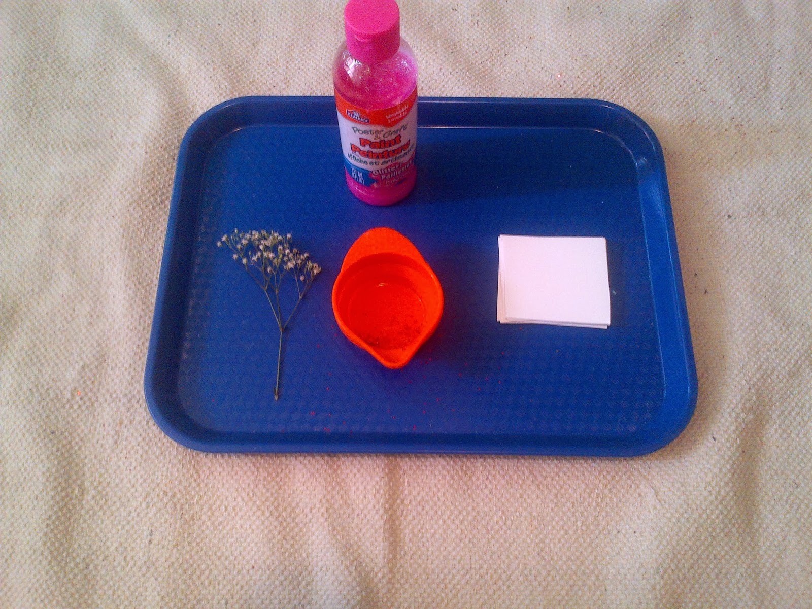 This is our flower-painting invitation, which is more Reggio. I cut off a tiny sprig of Ella’s bouquet for her to dip in the pink glitter paint and decorate the small white squares. This is another tray whose work provides the materials necessary for another tray.