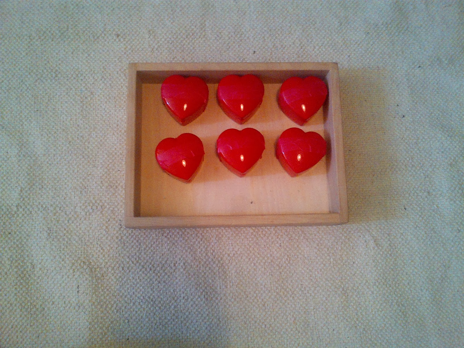 This is my Valentine’s day twist on sound cylinders. I used six heart-shaped containers and filled up two each with: mulch (could use cotton buds if you had them), rice, and beans. The sound cylinders should be matched on sound and placed in order from “softest” to “loudest.”