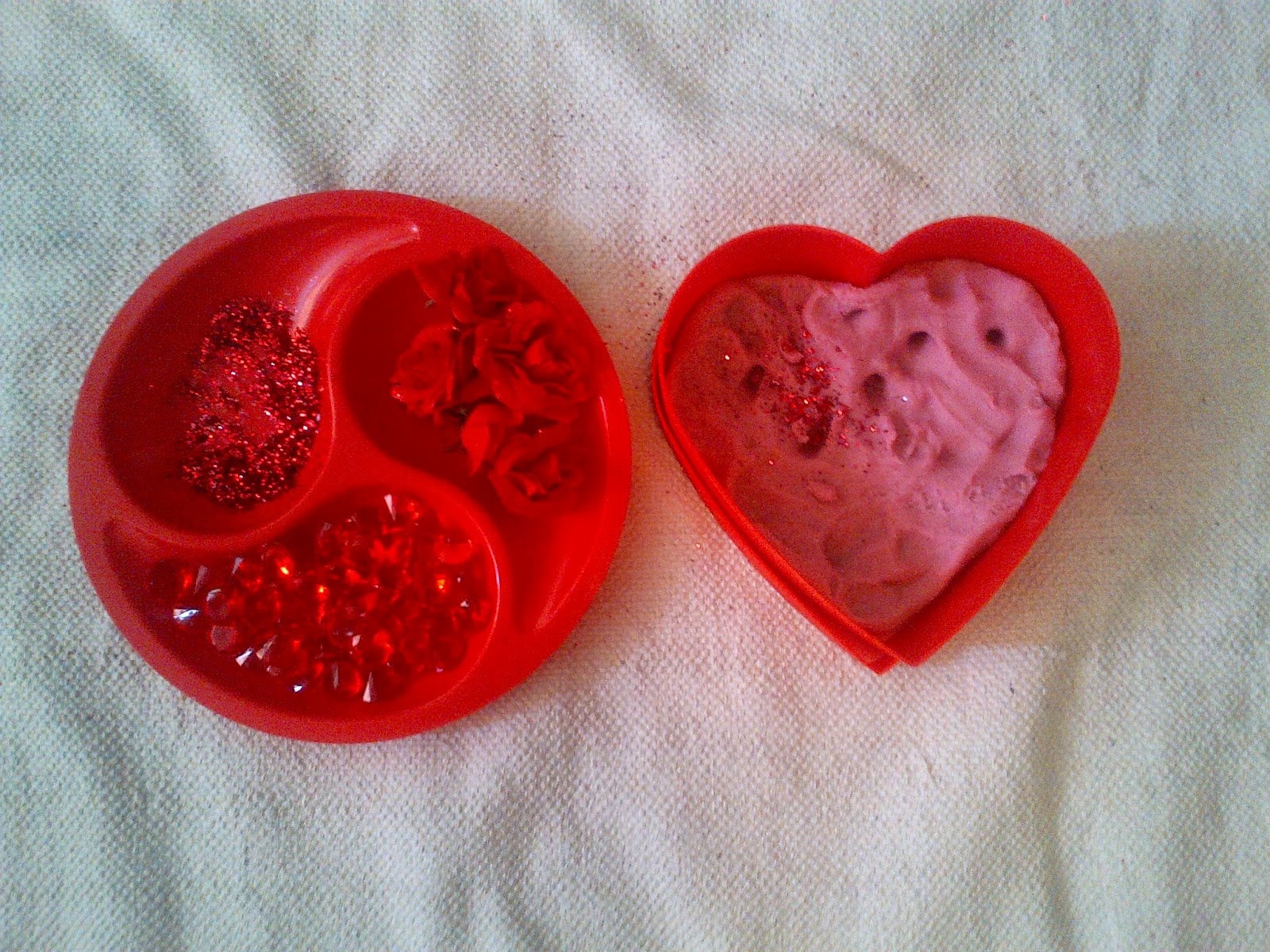 This is our playdough invitation for Valentine’s day. In the section plate there is red glitter, red gems, and red (artificial) roses. In the red heart box I placed our rose-scented playdough.